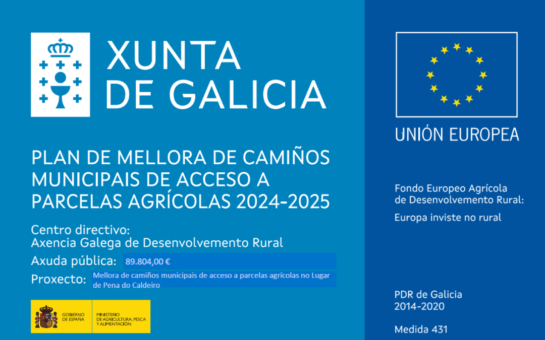 Licitación do contrato de obras de «Mellora de camiños municipais de acceso a parcelas agrícolas no Lugar de Pena do Caldeiro», incluído no Plan de mellora de camiños municipais de acceso a parcelas agrícolas 2024-2025 da Axencia Galega de Desenvolvemento Rural (AGADER) e cofinanciado polo Fondo Europeo Agrícola de Desenvolvemento Rural (FEADER) ao abeiro do Programa de Desenvolvemento Rural (PDR) 2014-2020.