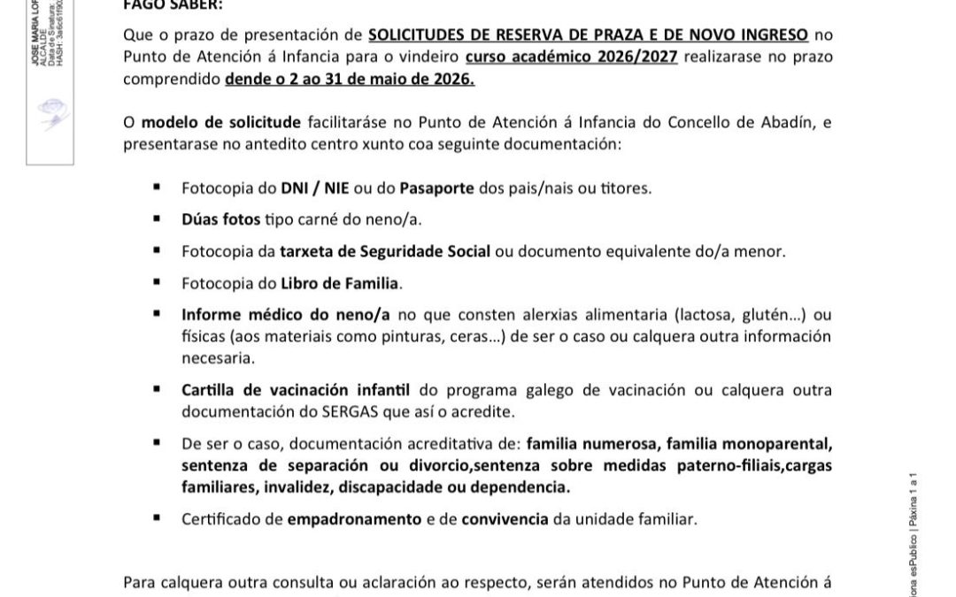 📢 O Concello de Abadín informa da apertura do prazo para a presentación de solicitudes de reserva de praza e novo ingreso no Punto de Atención á Infancia para o curso 2026/2027.